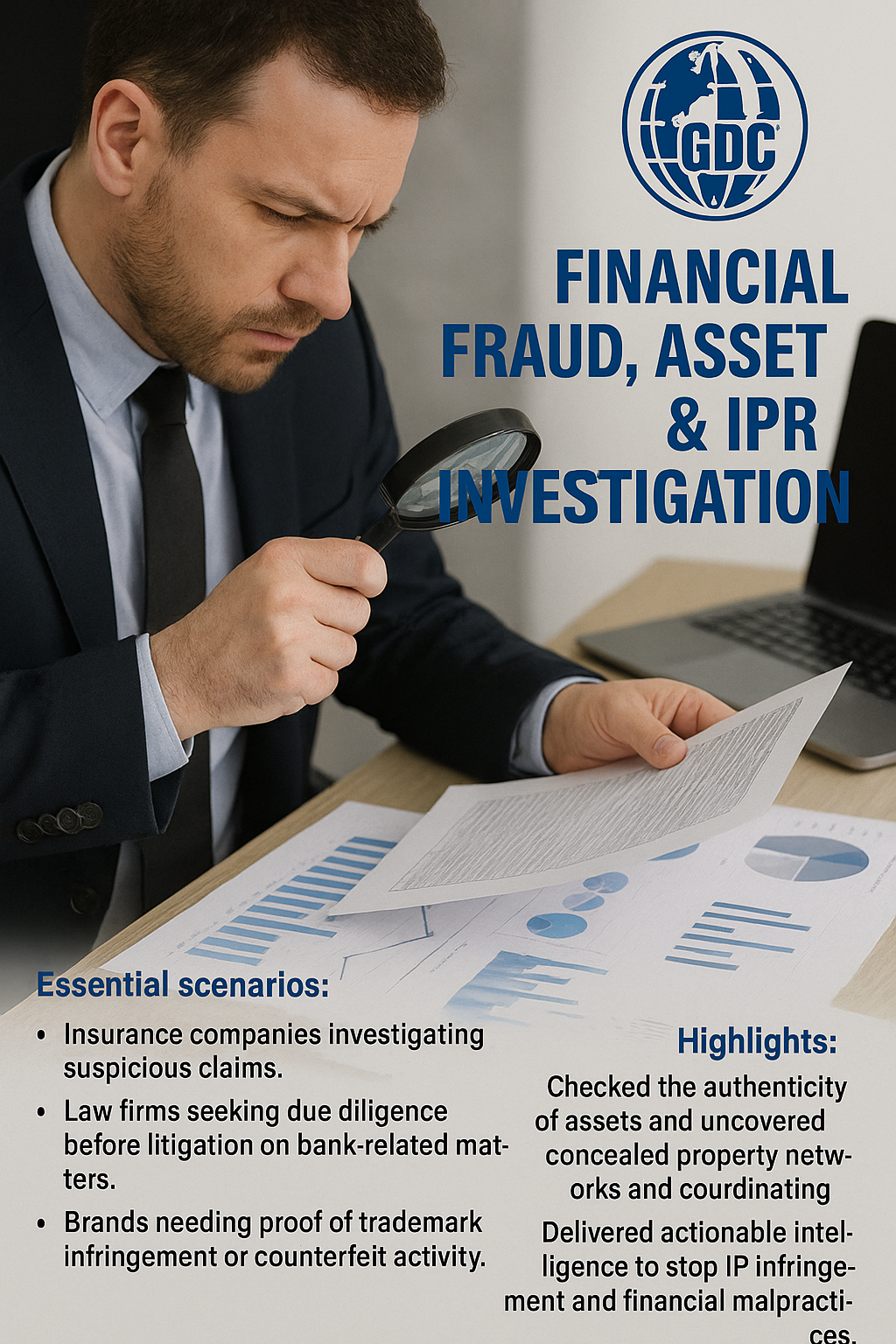 Financial Fraud, Asset & IPR Investigations Corporate and legal professionals often rely on investigative support to uncover hidden risks. GDC specializes in...